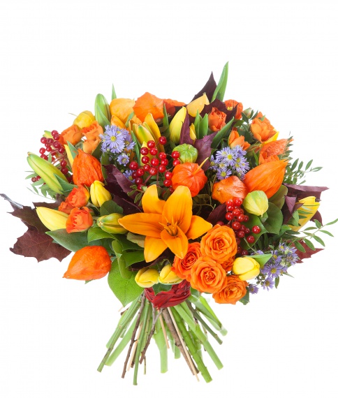 Состав: Гиперикум красный - 5, Салал - 10, Роза кустовая оранжевая - 5, Физалис - 2, Фисташка - 5, Астер лиловый - 3, Лилия азиатская оранжевая - 3, Тюльпан желтый - 10, Дуб красный - 2